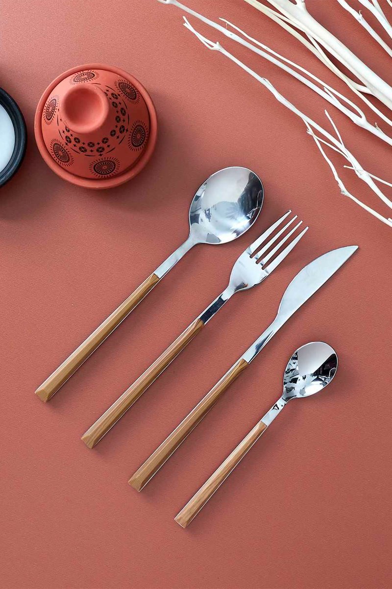 Cubertería de acero inoxidable efecto madera que incluye: