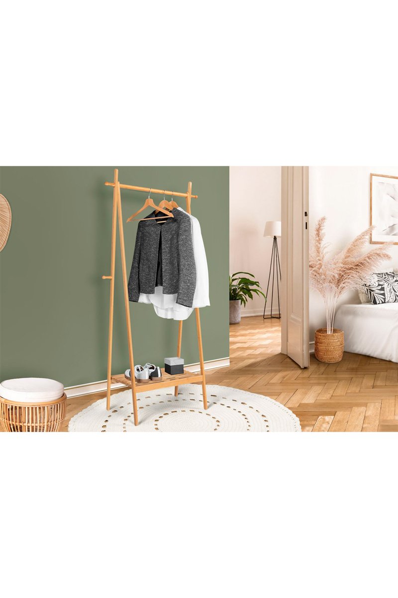 Perchero plegable con estante de bambú macizo.