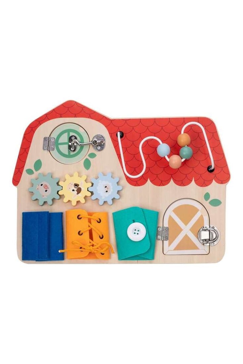 Tablero de actividades de madera colorido que proporciona diversión a tu peque.