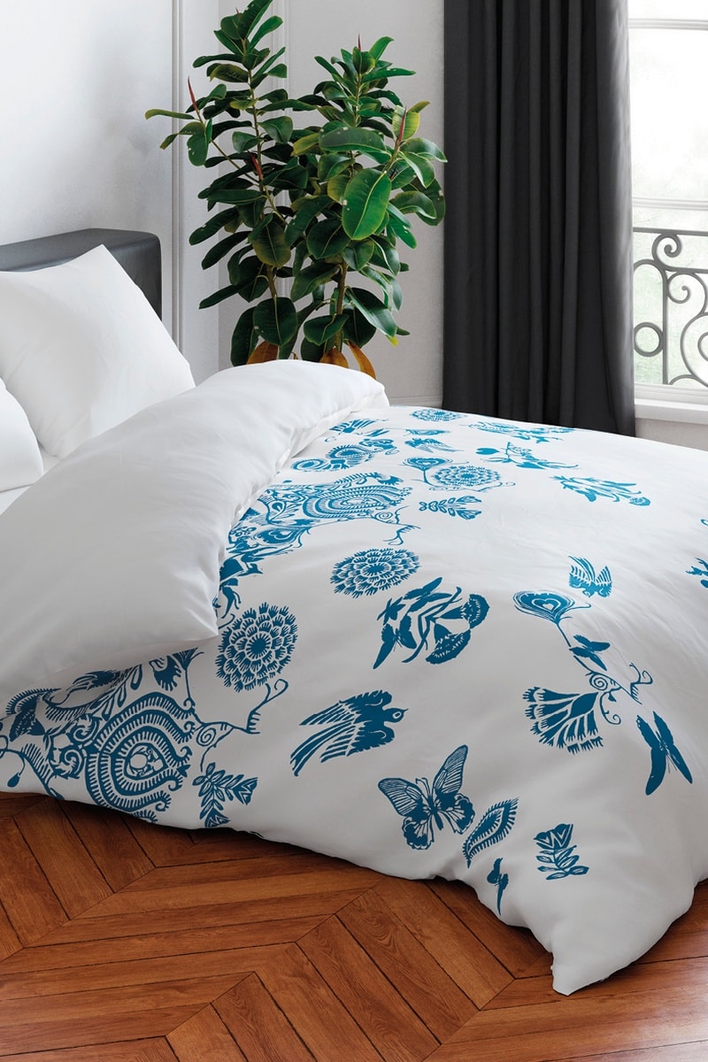 Juego de nórdico de satén de algodón 80 hilos/cm² Love Stories - Blanco e índigo