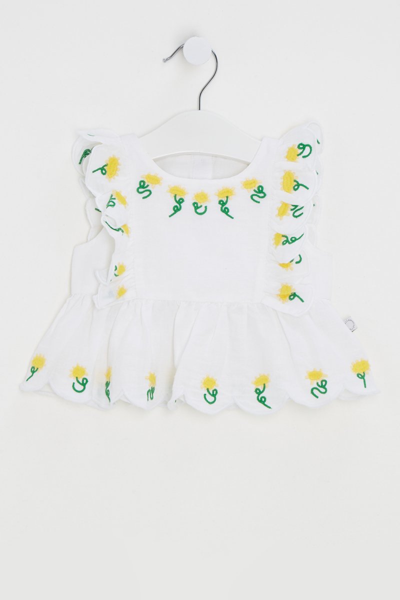 Estampado de flores bordadas delante, detrás y en el bajo.
