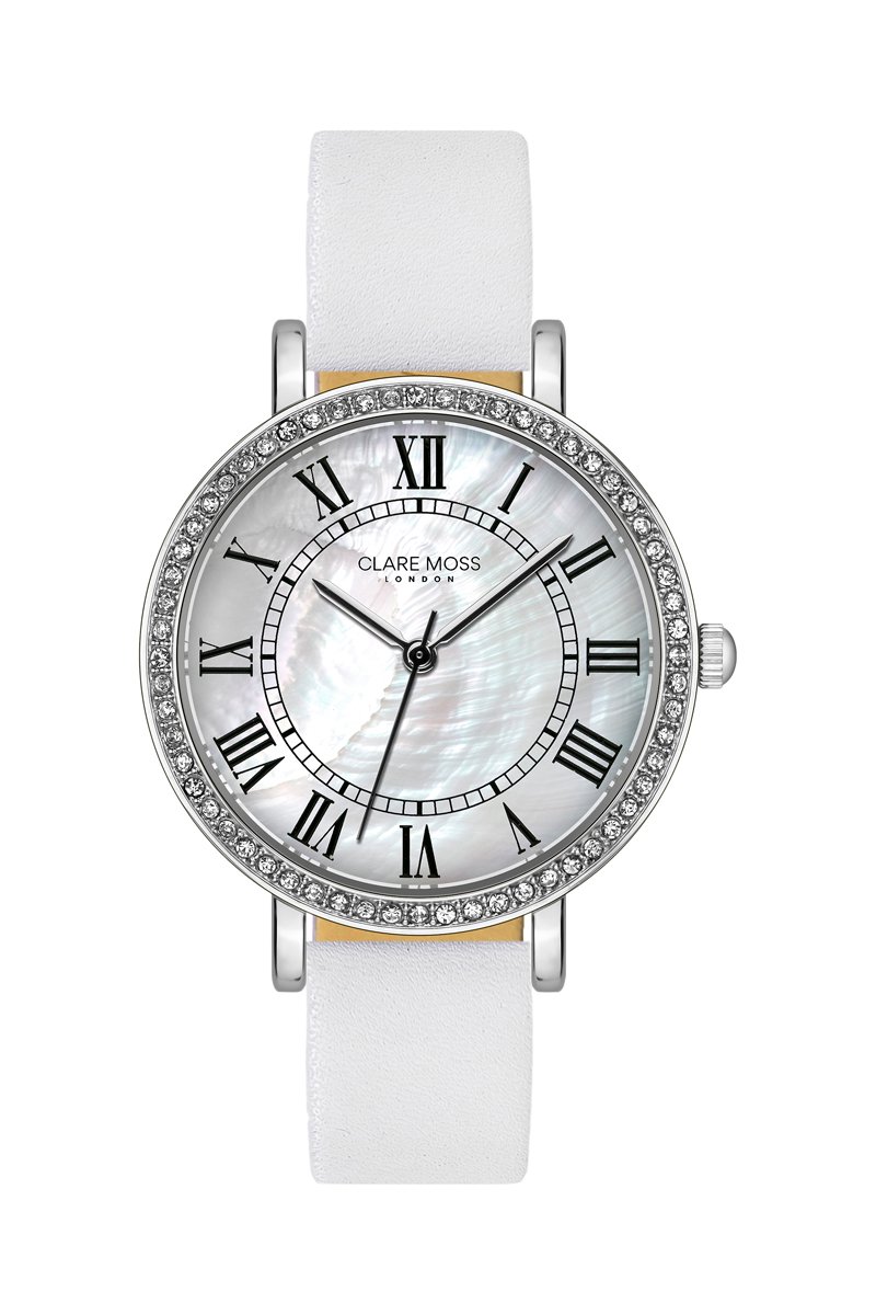 Reloj de cuarzo de piel bovina, nácar y circones Symphony - Blanco y plateado