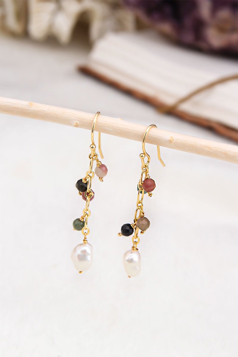 Pendientes chapados en oro amarillo con una perla cultivada y 4 turmalinas.