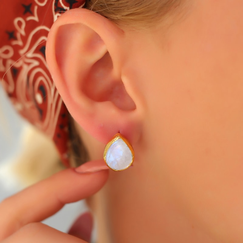 Enamórate de estos pendientes de latón chapado en oro, con piedras de luna, aportando un toque de luz y sofisticación a tu look. Un dúo perfecto entre elegancia y misterio.