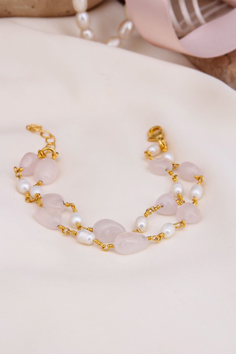 Material: latón, cobre, cuarzos rosas y perlas de imitación