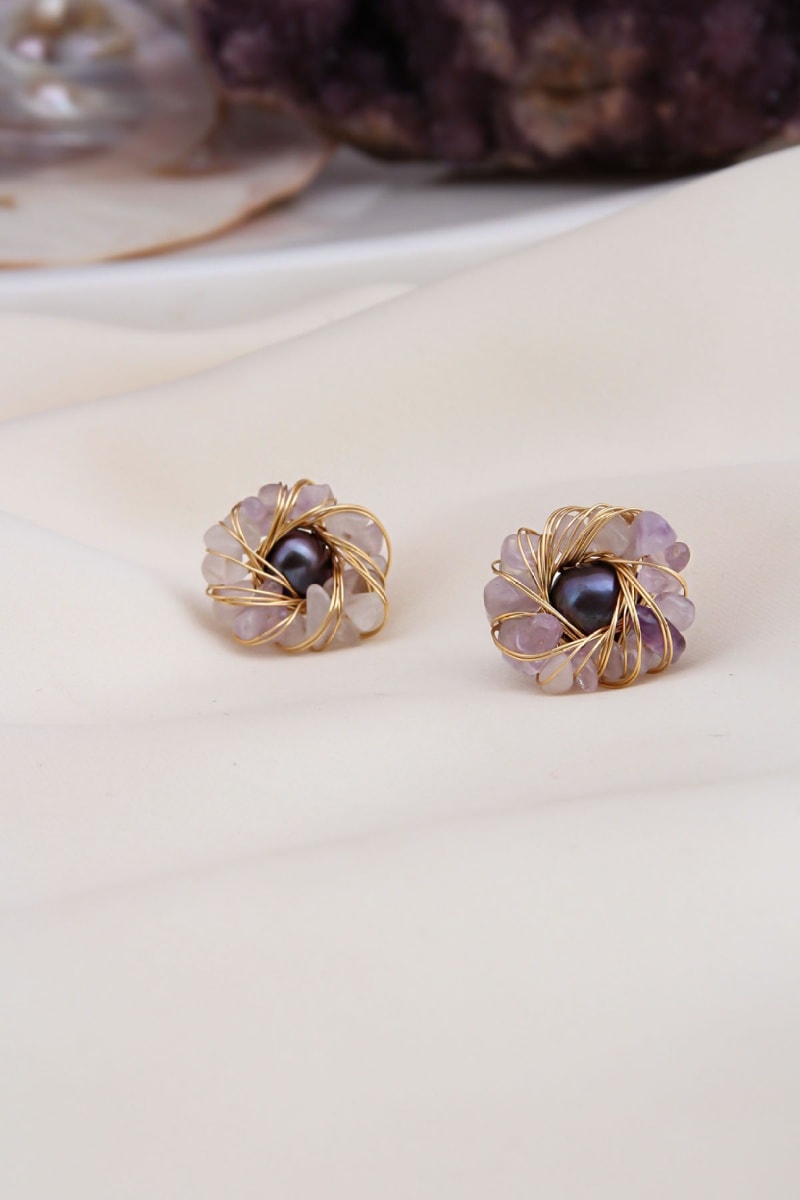Pendientes con amatistas y una perla de imitación.