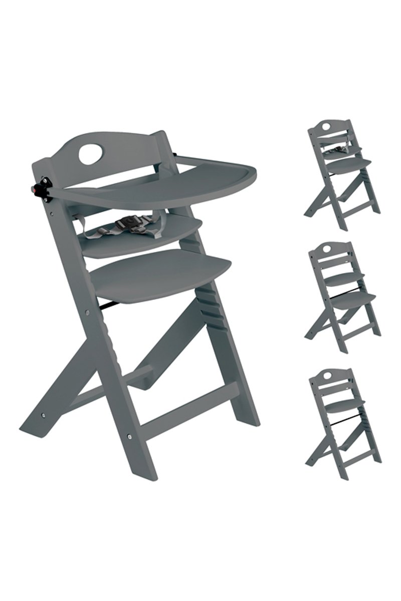 Trona de madera de haya resistente con asiento y reposapiés ajustables.