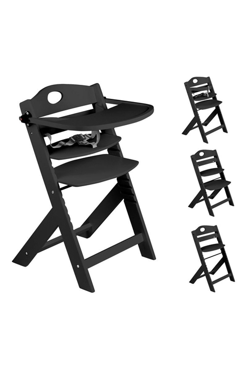 Trona de madera de haya resistente con asiento y reposapiés ajustables.