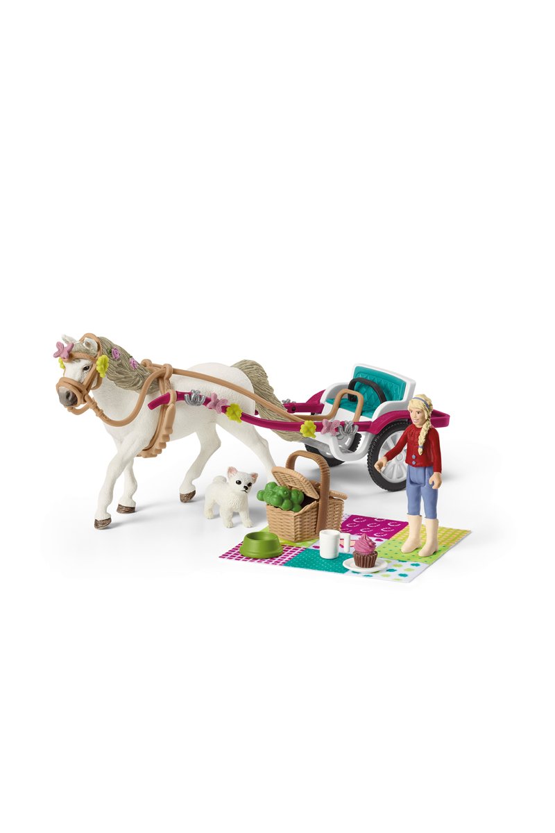 Para el espectáculo del Horse Club de Schleich®, el coche de caballos se ha decorado con mucho gusto con tréboles, herraduras y mariposas. Clara también ha adornado la cabellera de su poni Connemara con magníficos elementos decorativos. El práctico compartimento permite guardar una manta de picnic y una cesta bien llena. Además, Clara puede sentarse cómodamente sobre la manta durante el espectáculo ecuestre, mientras acaricia a su chihuahua y come algo de lo que ha preparado en la cesta.