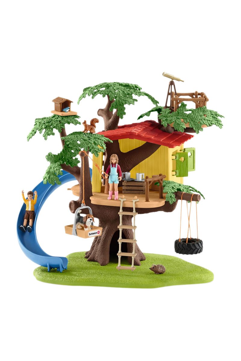 Cabaña aventuras en los árboles. En su cabaña en los árboles Schleich®, Sarah y Ben, los dos hijos de la familia de los granjeros, se divierten, juegan y meriendan durante horas. ¿Nunca soñaste con tener tu propia cabaña en un árbol? El kit tiene muchas funciones para jugar durante horas. Ben observa los animales desde la plataforma mientras que Sarah se tira por el tobogán. El perrito les espera allí. Sarah puede volver a subir a la cabaña por las escaleras. Con un aparejo, el perrito beagle se puede subir fácilmente a la cabaña. Así, todo el mundo puede jugar juntos. En el hueco del tocón del árbol, el erizo tiene también su casita, mientras que, en cambio, anida en las ramas. 2 muñecos humanos, 4 animales y superaccesorios. El kit completa perfectamente la Granja con estable y animales 42407 que se vende por separado. Los muñecos Schleich® se realizan con detalles muy realistas y están pintados con amor, para que el juego sea pedagógico. .