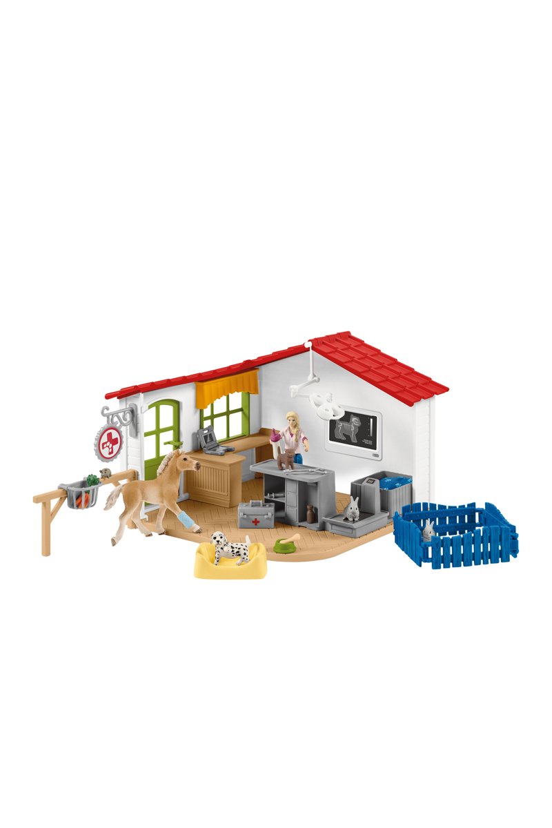 En la clínica veterinaria de Schleich Farm World, todos los animales pacientes se tratan con cuidado y amor. Para ello, pueden confiar en la veterinaria. Tiene siempre a mano el equipo médico. Gracias a la radiografía de la pared, puede tratar a sus pacientes en la mesa para examinar y elegir rápidamente el medicamento de su maletín. Con la báscula, la veterinaria puede verificar el peso de los conejos para que se recuperen rápidamente en la hierba del recinto. ¿Quién en el próximo?