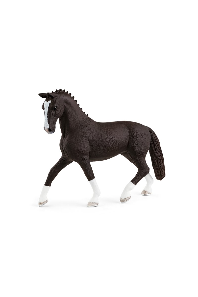 La crin de la yegua hannoveriana azabache del Horse Club Schleich® está trenzada con pequeños moñetes para la competición. Con su dinámica pose, la yegua indica que está llena de energía y que se muere por llevar a cabo una actuación impecable junto a su jinete. La hannoveriana forma parte de las razas más antiguas de caballos de sangre cliente y está considerado como un excelente caballo en lo que a disciplinas ecuestres se refiere. Es fácil de entrenar, valiente, decidido, dócil y agradable.