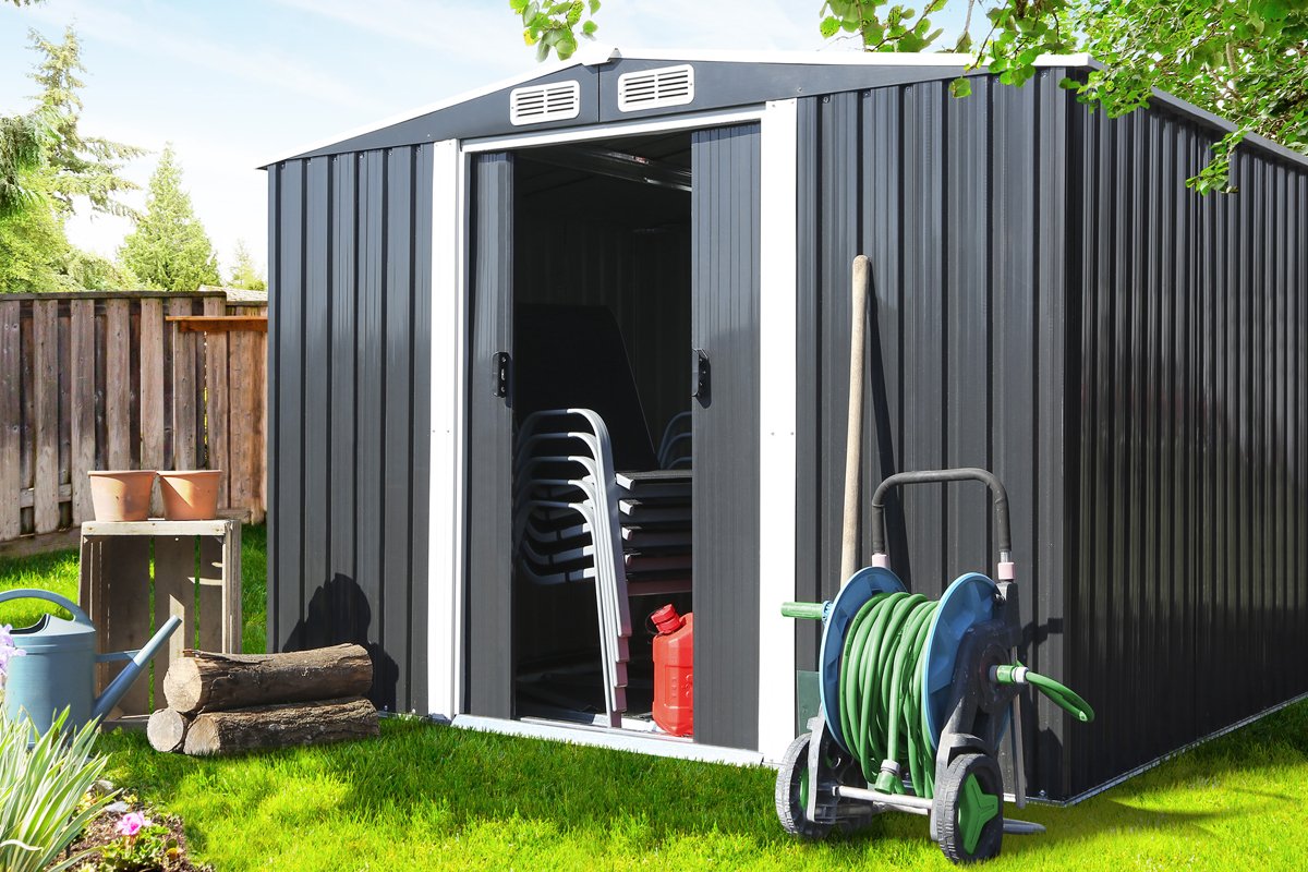 Para organizar y guardar todo el año herramientas, mobiliario de jardín, cortacésped.