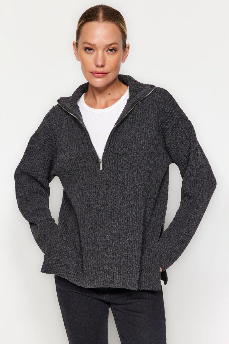 Cuello alto con cremallera.