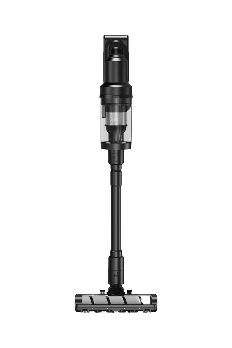 Aspirador escoba con bolsa y base de carga y de limpieza.