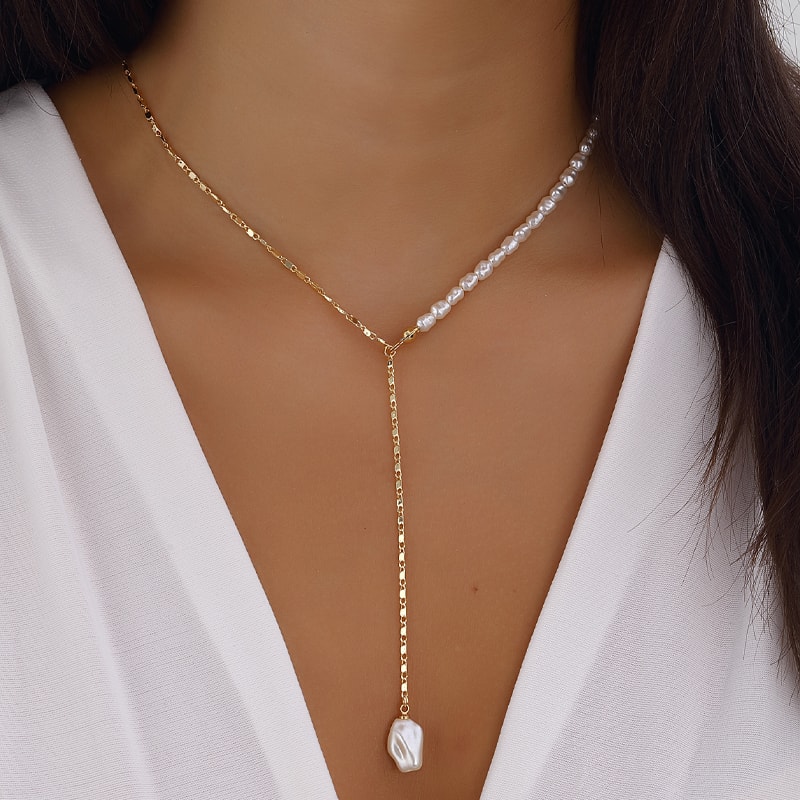 Enamórate de este collar elegante de latón chapado en oro, con un hilo de perlas delicadas y un colgante de perla fina. Esta joya sofisticada aportará un toque de glamur y finura a todos tus looks, tanto informales como formales.