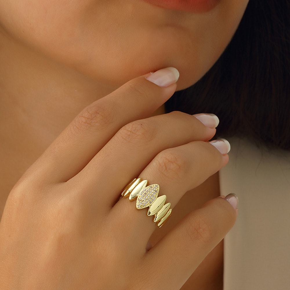 Aporte un toque de brillo a tus looks con este anillo ajustable bañado en oro fino, con un motivo central con circones resplandecientes. Su diseño atrevido y elegante hace que sea una pieza potente para llevar sola o con otras.
