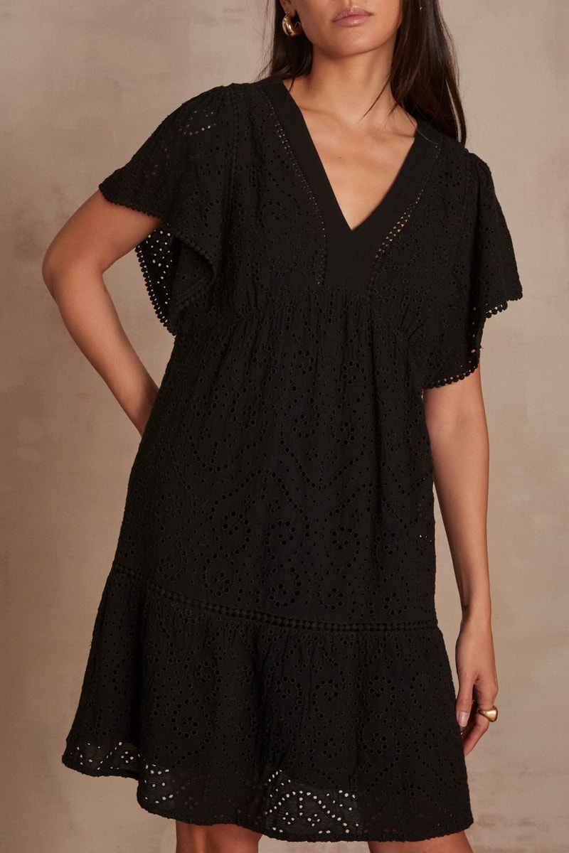 Vestido evasé con bordado inglés - Negro