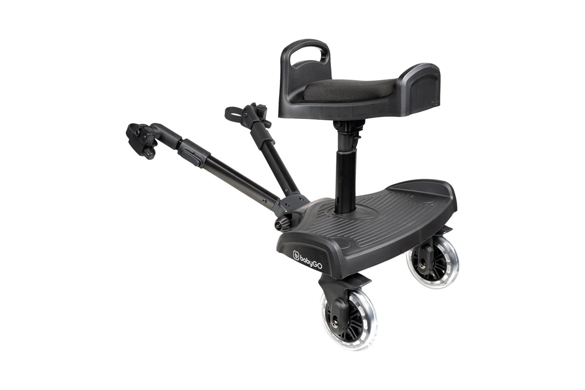 Este patinete con ruedas práctico se puede fijar fácilmente a casi todas las sillas de paseo y ofrece a tu peque un paseo cómodo, de pie o sentado.