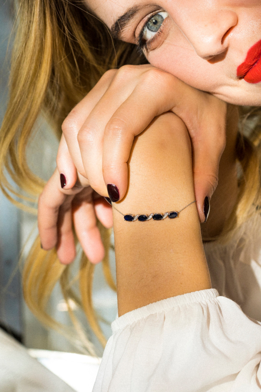 Pulsera de oro blanco con 9 diamantes y 4 zafiros.