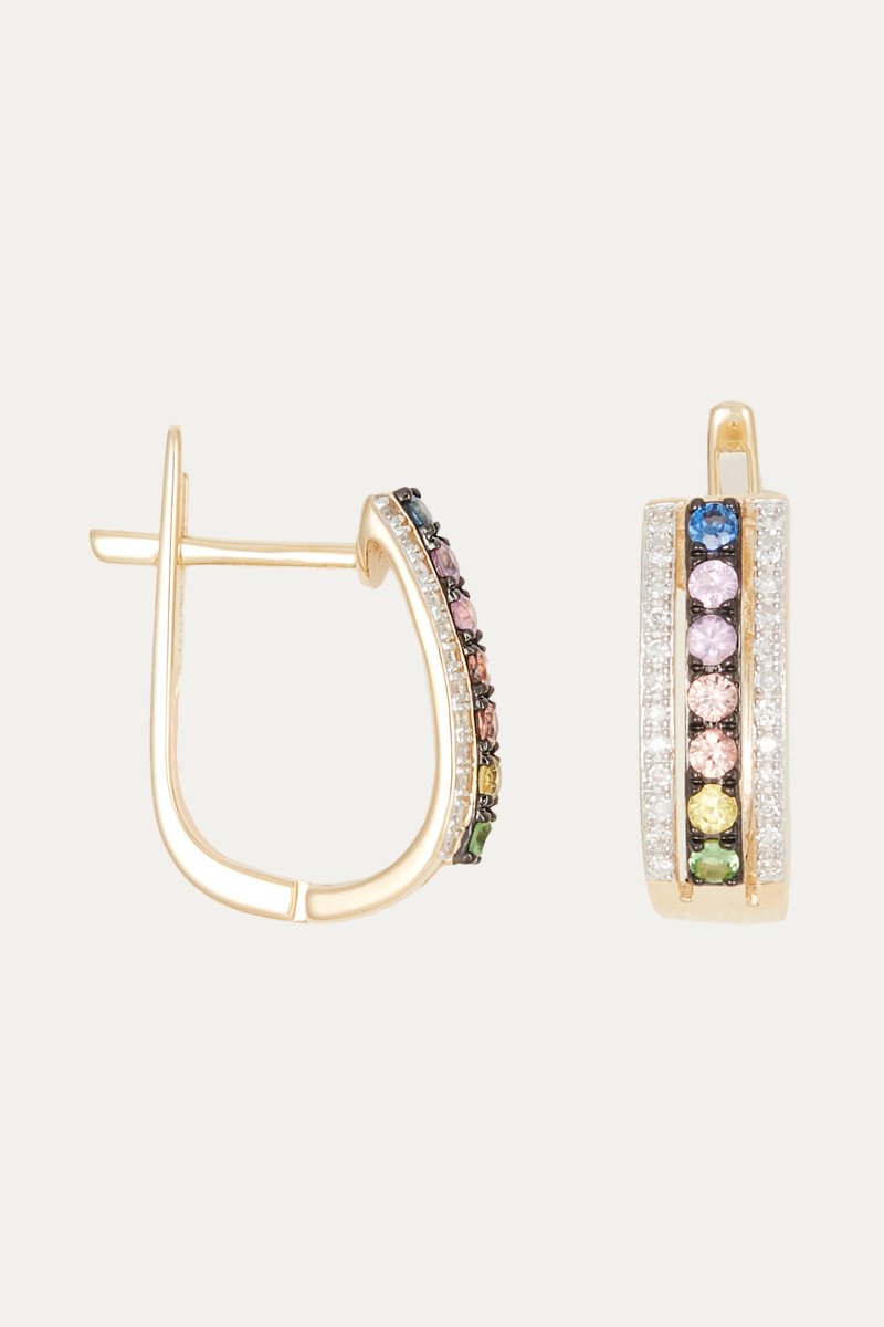 Criollas de oro amarillo con diamantes, granates y zafiros.