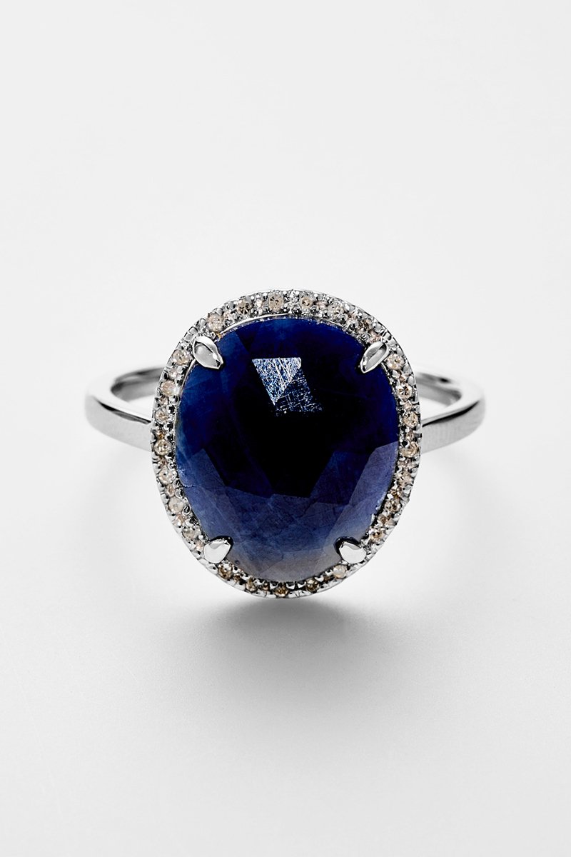 Anillo de oro blanco con 25 diamantes y un zafiro.