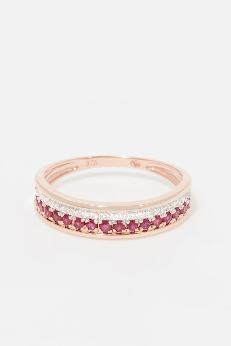 Material: oro rosa 375/1000, rubí de 0,26 quilates/16 y diamantes 0,07 quilates/26