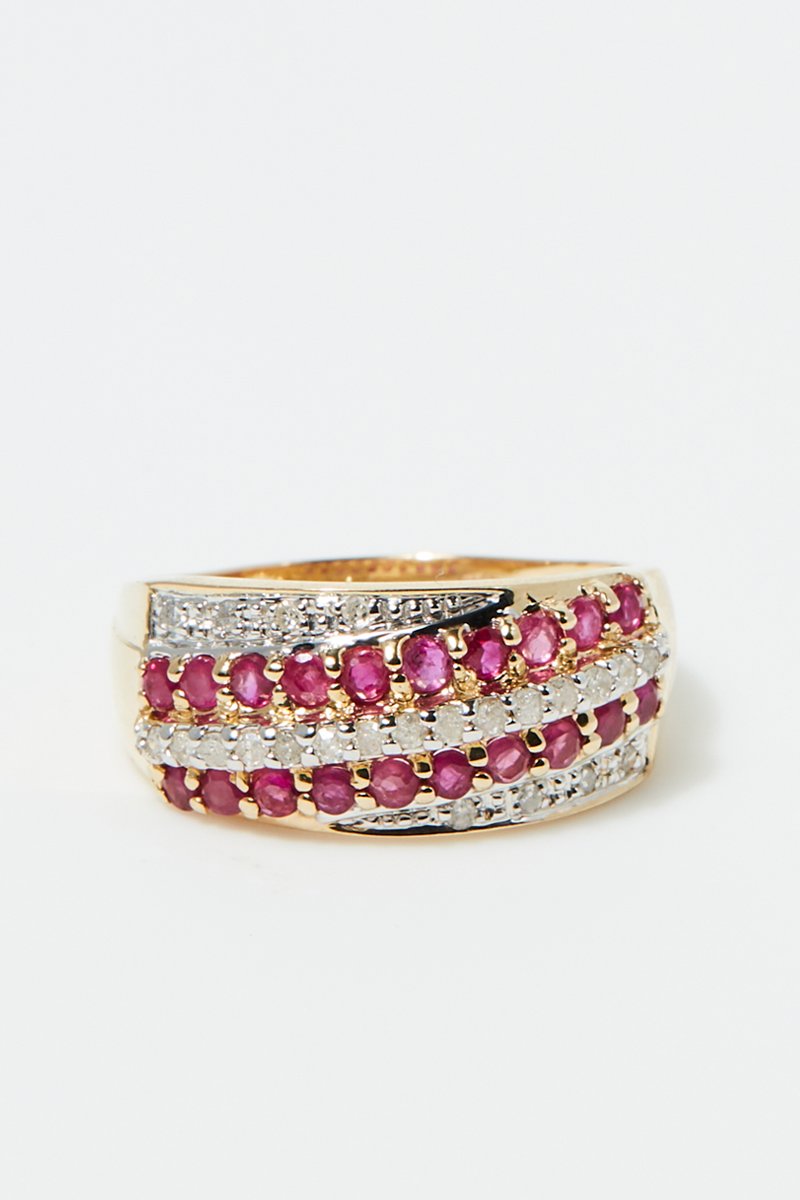 Anillo de oro amarillo con 23 diamantes y 20 rubíes.