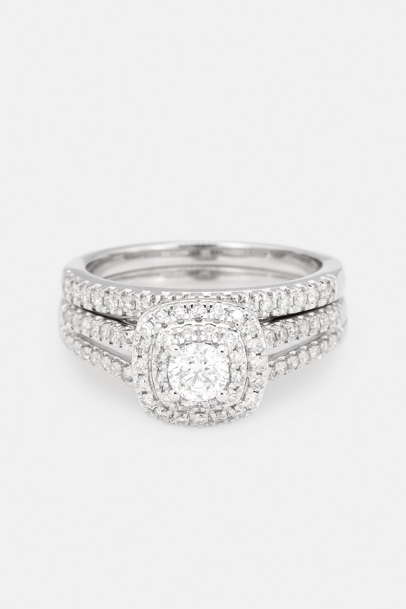 Alianza y solitario de oro blanco con 77 diamantes.