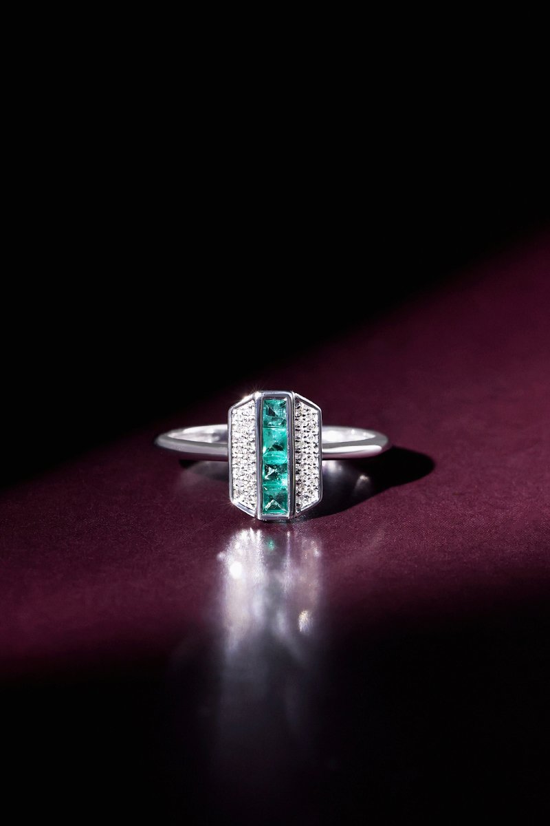Anillo Katell - Oro blanco, diamantes y esmeraldas