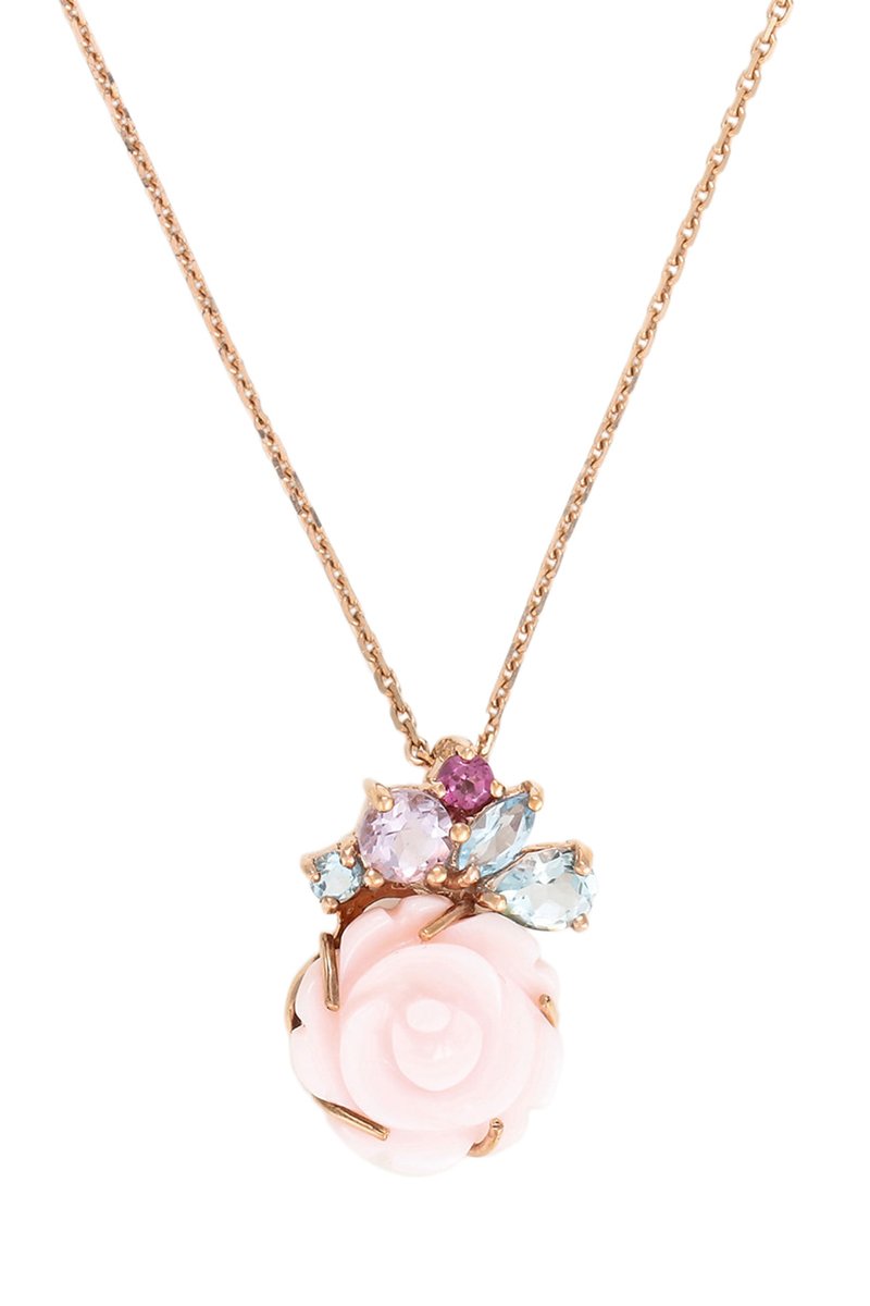 Colgante de oro rosa con 3 topacios, una rodonita, una amatista rosa y nácar.