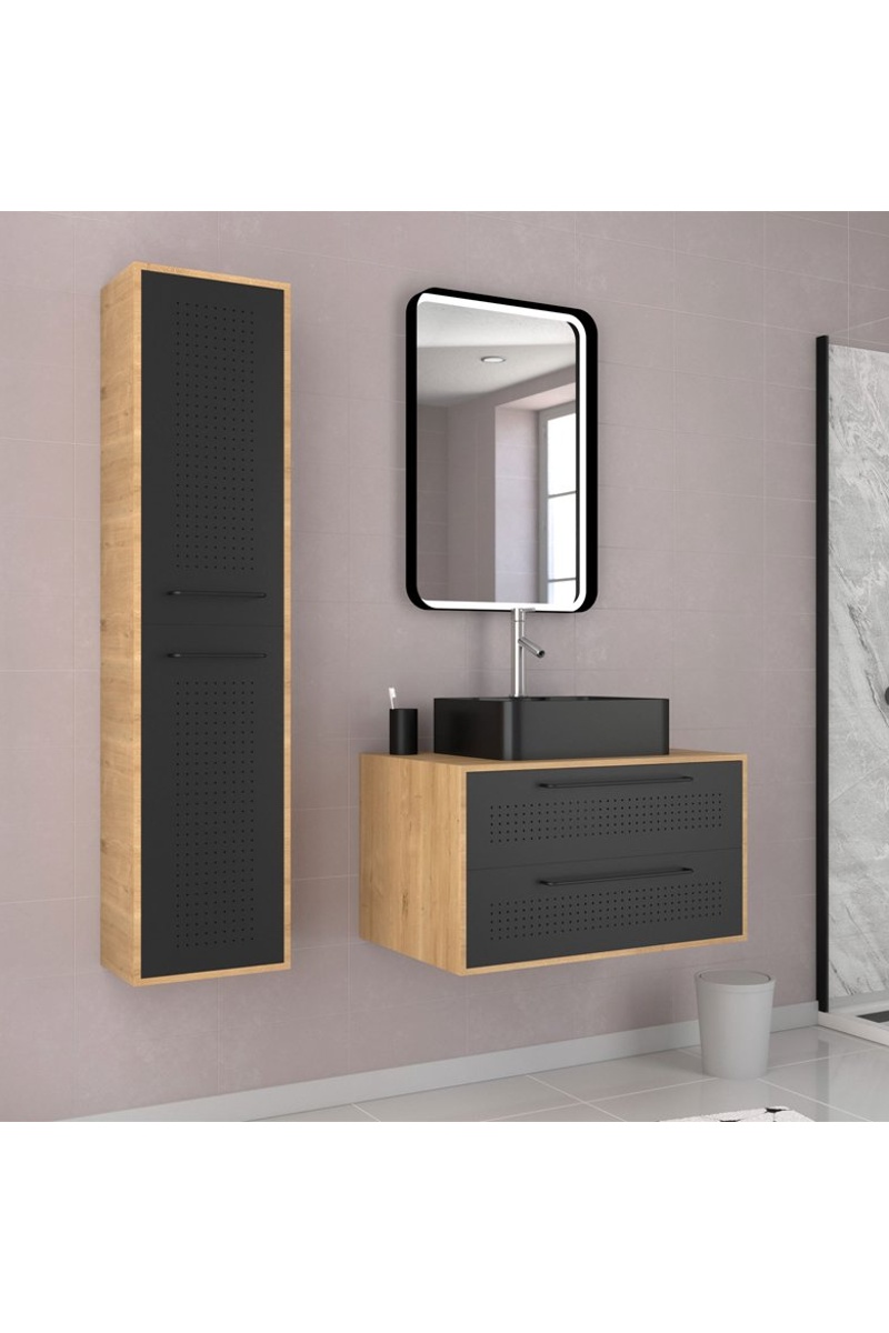 Mueble de cuarto de baño con 4 cajones, columna de 2 puertas, lavabo y espejo con LED - Imitación roble natural y negro