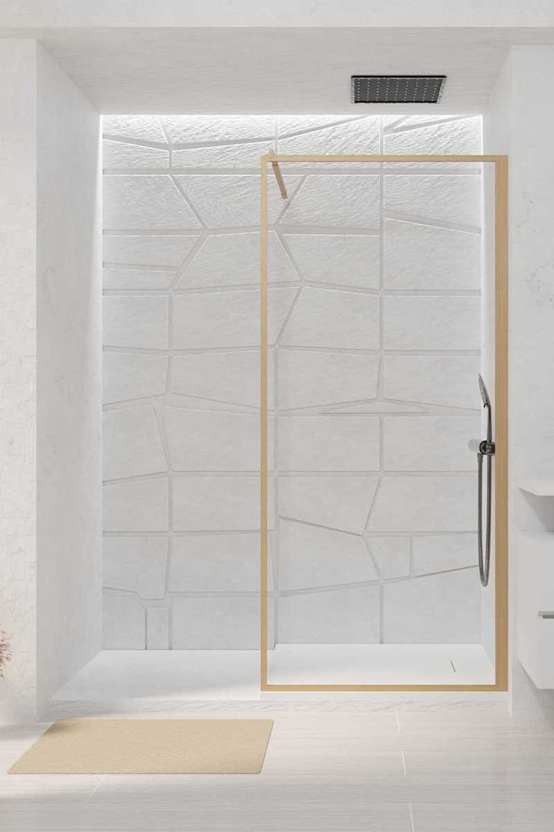 Elegante y natural, la mampara de ducha efecto madera WOODEN CONTOURING transformará tu ducha italiana en un remanso de paz. Con su acabado de madera efecto natural, esta mampara invita a relajarse, aportando un toque cálido y apacible a tu cuarto de baño. Su diseño inspirado en la naturaleza crea una atmósfera serena y relajante, ideal para un momento de bienestar diario.