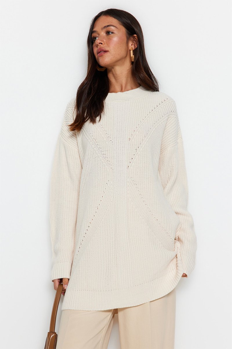 Jersey largo de punto grueso, calado y de canalé.