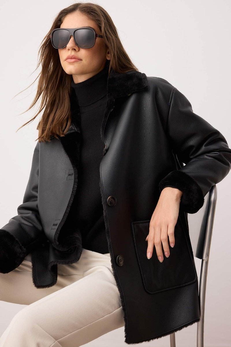 Detalles de pelo sintético en el cuello y las mangas.