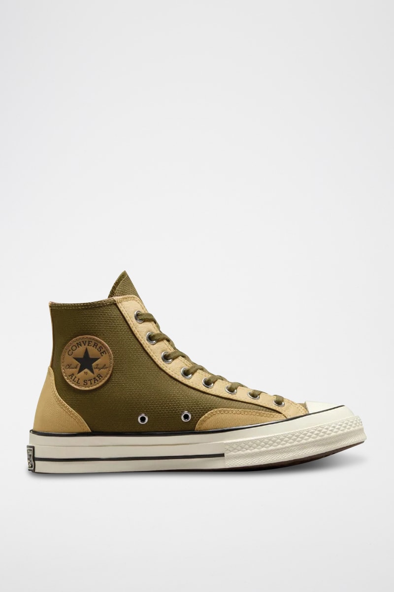 Orificios metálicos, parche con texto y estampado de estrella en el lateral.