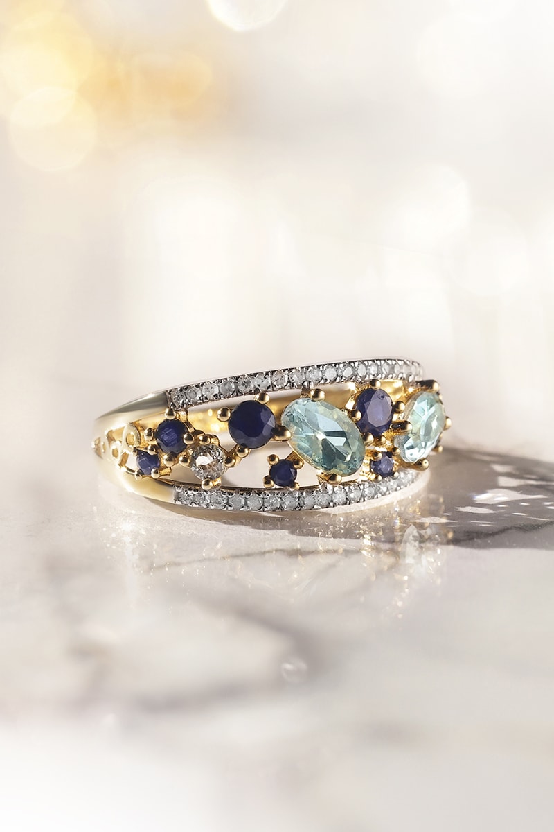 Anillo Dahra - Oro amarillo, diamantes, topacios y zafiros