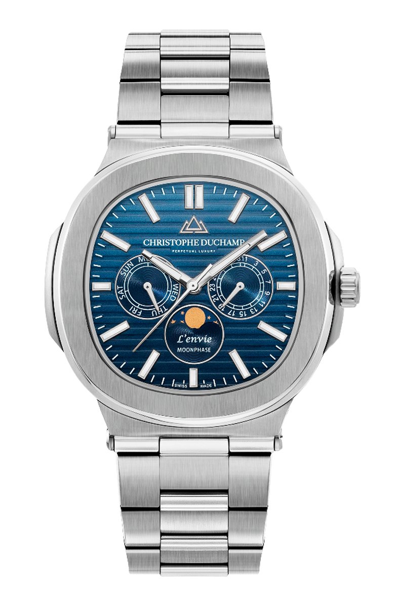 Reloj de cuarzo de acero L’Envie - Contador de fase lunar - Plateado y azul