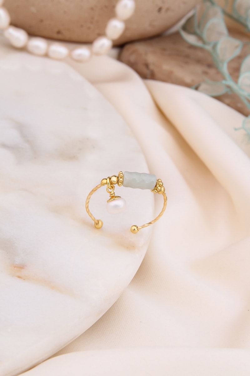 Anillo ajustable con una labradorita y una perla de imitación.