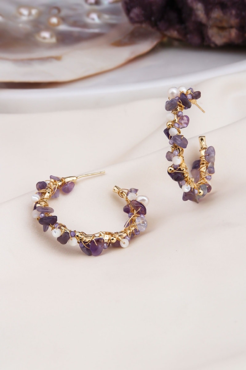 Criollas chapadas en oro amarillo con amatistas y una perla cultivada.