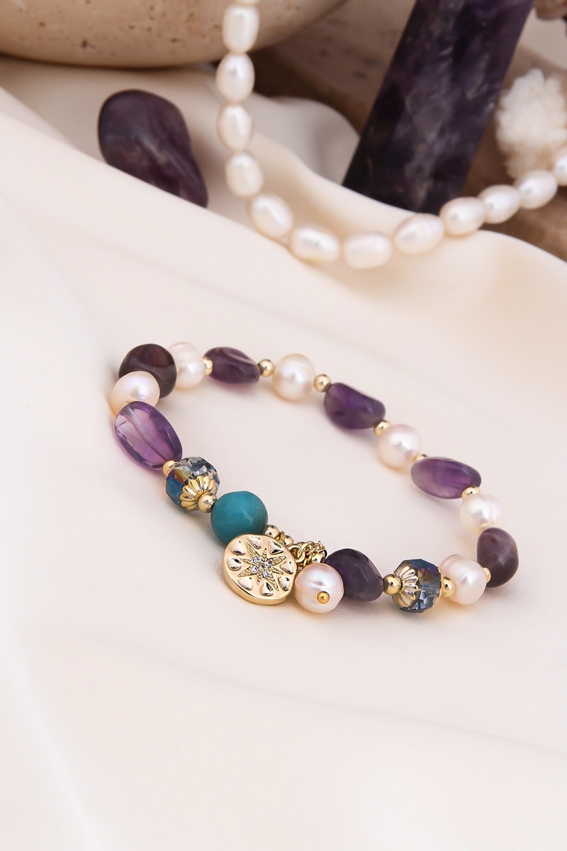 Pulsera con amatistas y perlas de imitación.