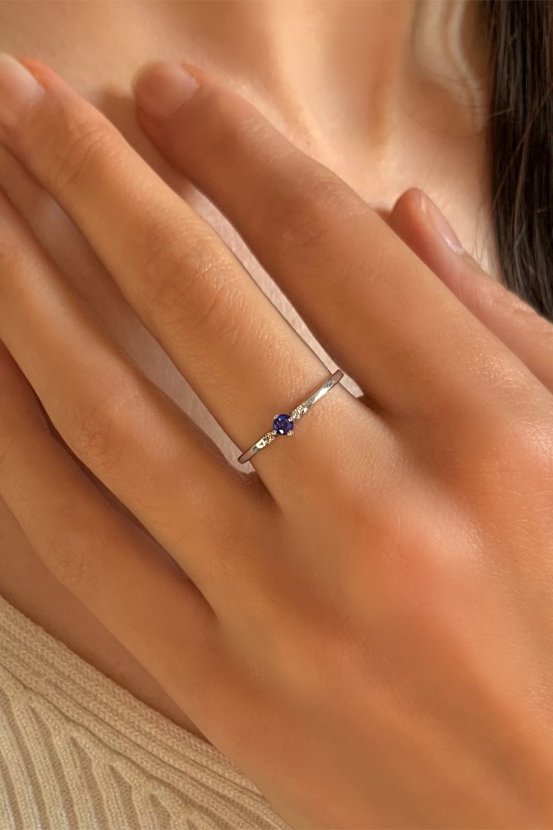 Anillo de oro blanco con 2 diamantes y un zafiro.