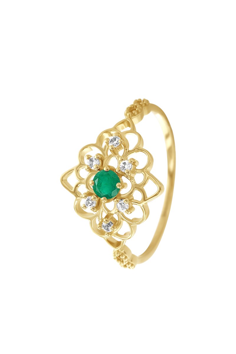 Anillo de oro amarillo con 6 topacios y una esmeralda.