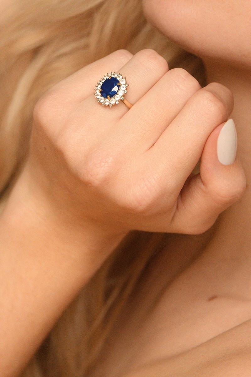 Anillo de oro amarillo con 28 topacios y un zafiro.