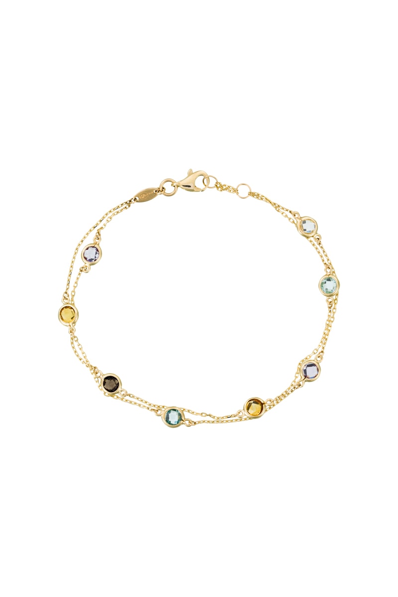 Pulsera de oro amarillo con 2 topacios azul celeste, 2 citrinos, 2 amatistas y 2 cuarzos blancos.