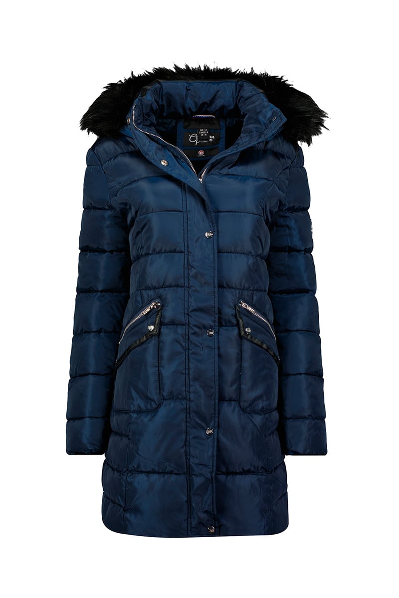 Capucha extraíble con pelo sintético y tira con botón a presión.