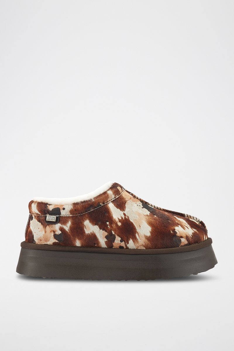 Zuecos de piel y lana ovina con plataforma - Marrón