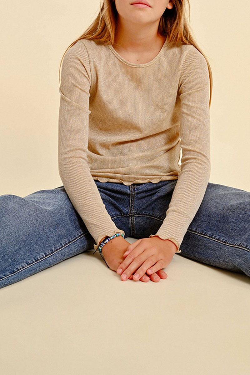 Jersey fino con brillo de manga larga festoneada.
