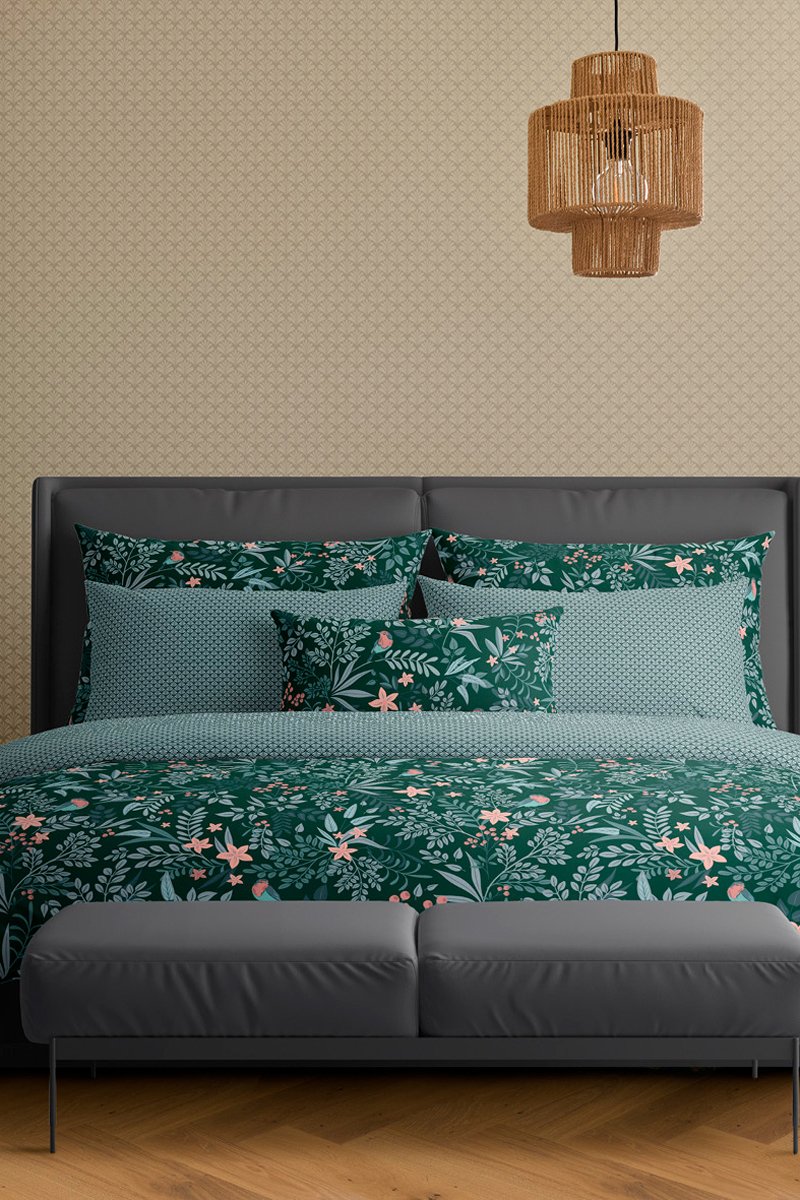 Juego de nórdico de satén de algodón 80 hilos/cm² Harmonie des oiseaux - Verde y rosa