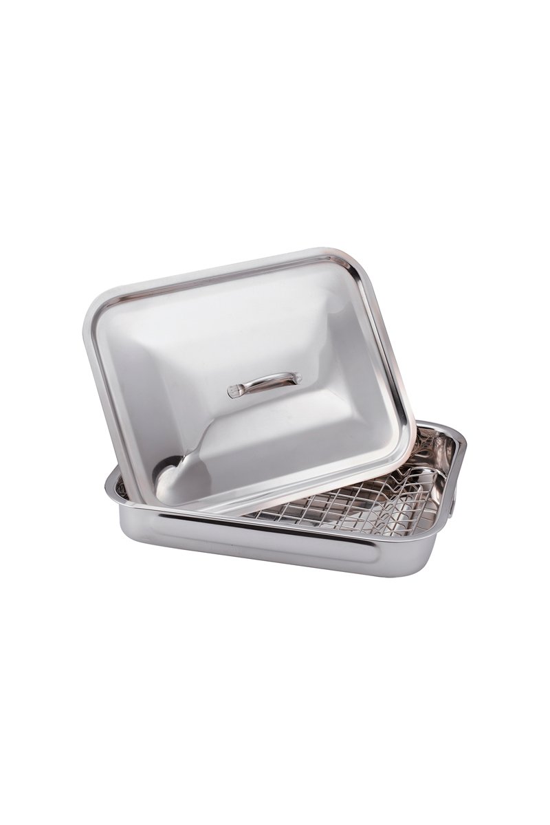 Fuente para asar de acero inoxidable con tapa.